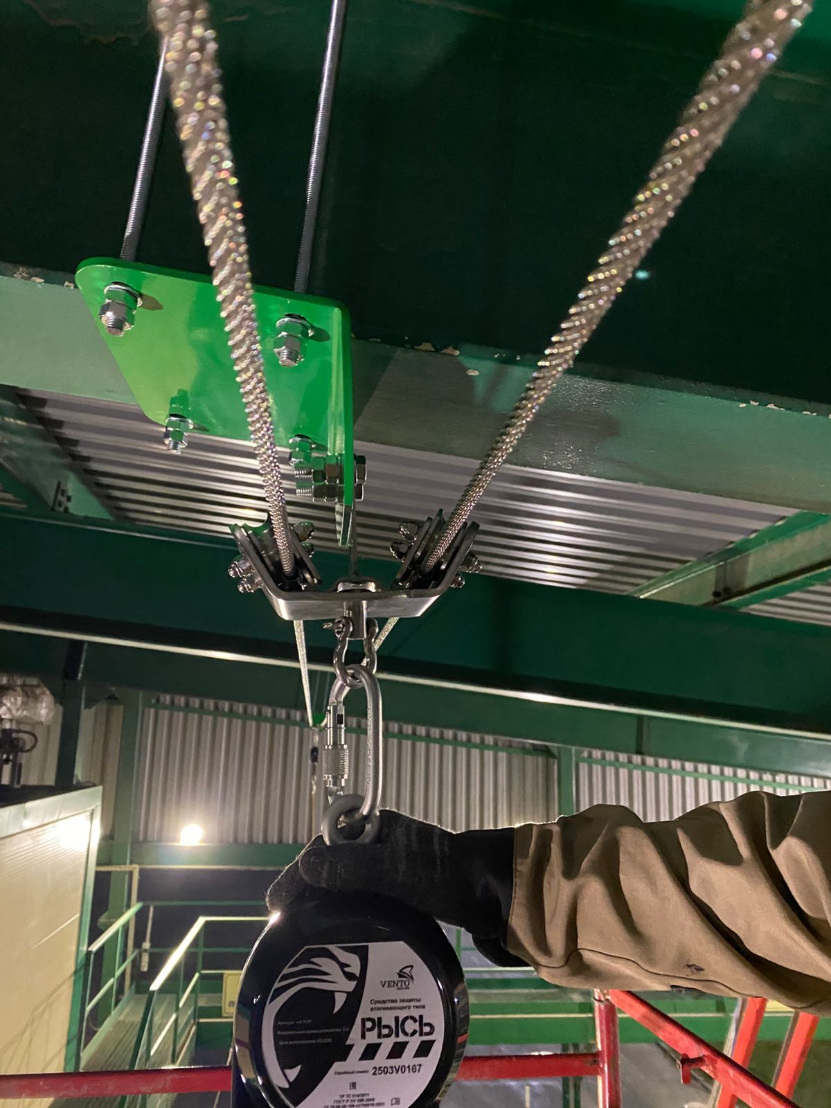 - В качестве соединительно-амортизирующей подсистемы использовалось сертифицированное СИЗ втягивающего типа «Рысь 10 м».