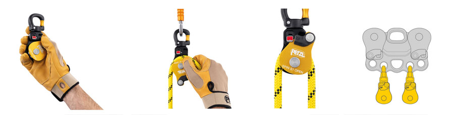 Отдельно стоит выделить разъемный элемент крепления на ролике Petzl SPIN S1 OPEN. Он позволяет присоединить ролик к анкерному устройству без дополнительного карабина. Это сокращает расстояние от анкерного устройства до ролика и позволяет поднять груз максимально высоко. Такое свойство может быть особенно актуально при работе под потолком.