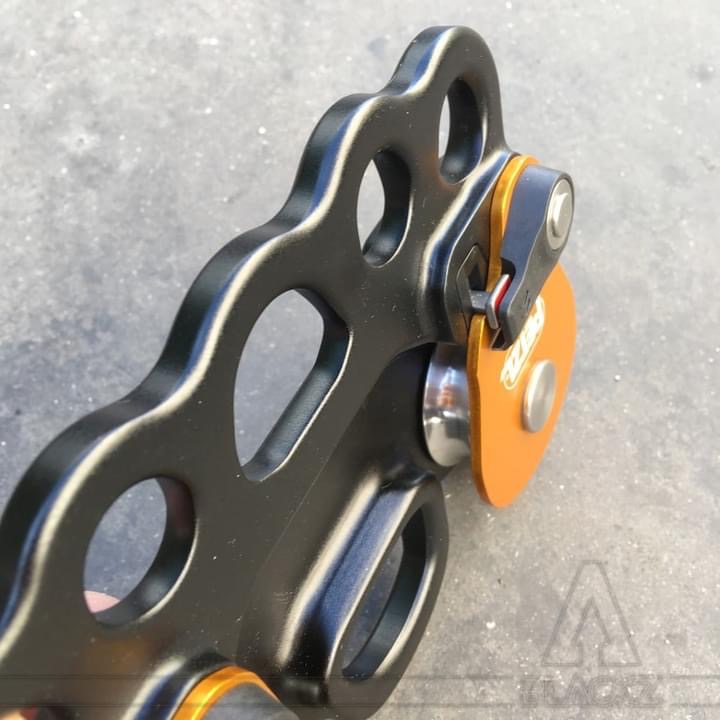 Это комбинация коннекторной пластины и роликов. Это решение предназначено для удобного передвижения по троллею. Благодаря такому решению уменьшается количество используемых элементов, сокращается расстояние от работника (спасателя) до троллея, сокращается расстояние между работником и рабочей зоной (актуально при работе под потолком). При спасательных работах иногда запас пространства до земли также важен. В этом случае спасатель с пострадавшим будет находиться выше от земли на несколько десятков сантиметров, ведь в системе отсутствуют карабины, которые обычно соединяют ролики и такелажную пластину, да и сама пластина более компактна.