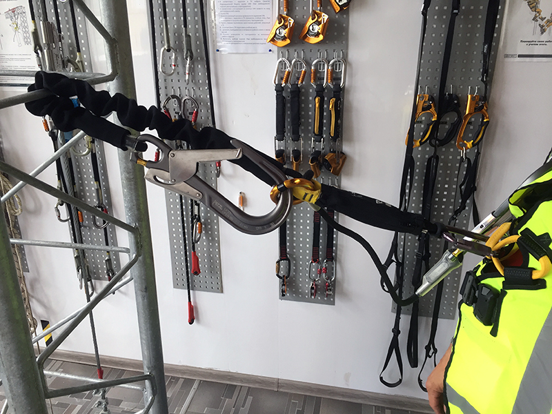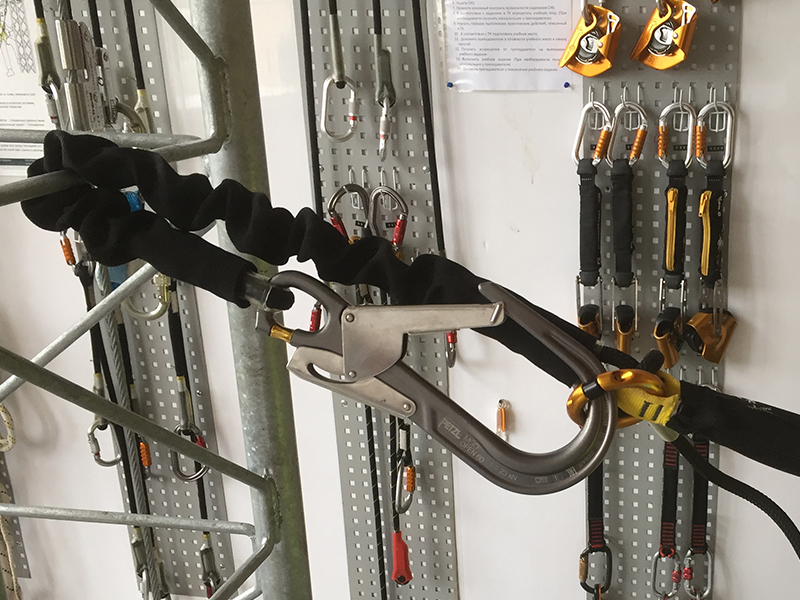 Использование стропов с амортизатором широко распространено для обеспечения безопасности при подъемах по лестницам, мачтам, вышкам и т.д. Ширина раскрытия запорного механизма соединительного элемента не всегда позволяет присоединить конечный анкерный соединительный элемент (карабин класса А) стропа к конструкции.