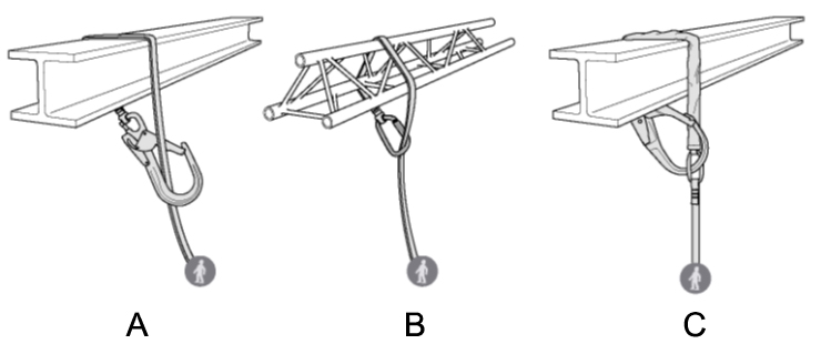 Перед использованием убедитесь, что строп не поврежден. Убедитесь, что поверхность конструкции не имеет острых граней или зазубрин. Соединительный элемент на стропе установлен и нагружен правильно. Исключены нагрузки на запорный элемент соединительного элемента, поперечные нагрузки на корпус соединительного элемента и т.д.