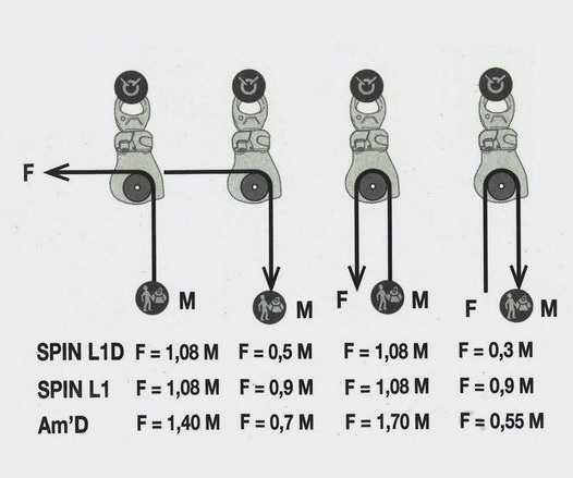 Это более интересное изделие. Оно комбинирует в себе свойства эффективного блока для подъема оборудования и фрикционного устройства, которое позволяет удерживать поднимаемое оборудование без использования дополнительных зажимов. Ролик (шкив) вращается только в одном направлении, то есть груз необходимо поднимать в строго определенном направлении. В противоположную сторону шкив не вращается, и при стравливании каната (веревки) создается трение, которое позволяет легче удерживать или спускать груз. Сходный шкив применяется в конструкции Petzl MAESTRO, так что прослеживается применение удачных решений из прошлых моделей при разработке новых элементов СИЗ. Усилие, которое требуется для подъема или удержания груза, представлено на рисунке. В случае, когда тяговый и грузовой канаты параллельны, требуется приложить усилие всего в 30% от массы груза для его удержания. Это проще, чем удерживать груз через карабин.