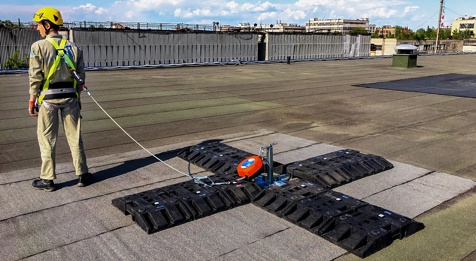 Обеспечение безопасности работ на высоте при производстве работ на плоской кровле, элементах сооружений или производственных объектов.