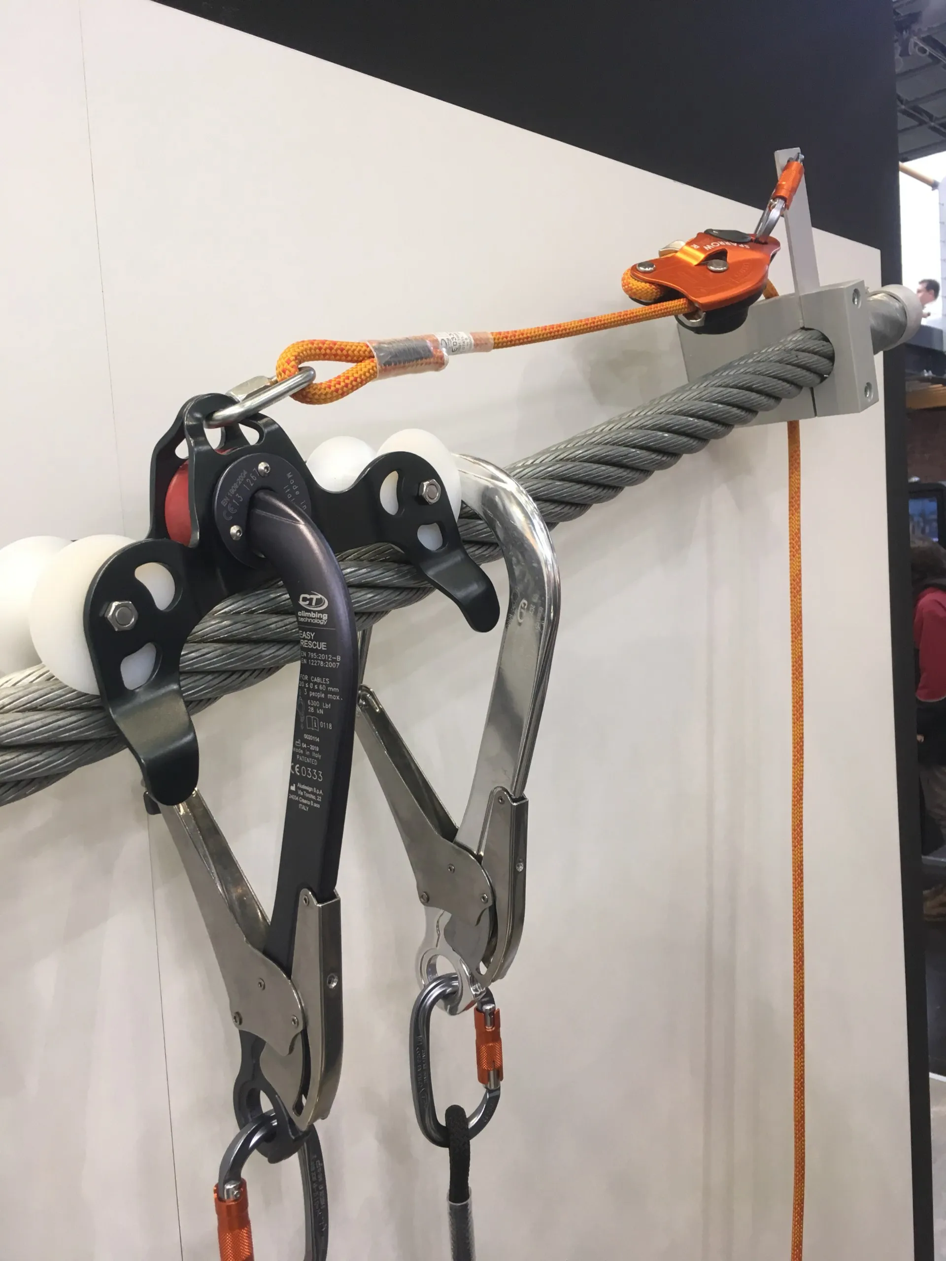 Комбинированный анкерный карабин и блок для перемещения по тросу канатных дорог. Он позволяет спасателям спускаться вдоль троса. Благодаря комбинации анкерного карабина и ролика обеспечивается дополнительная безопасность работника. Два ролика обеспечивают более плавное и стабильное передвижение по тросу.