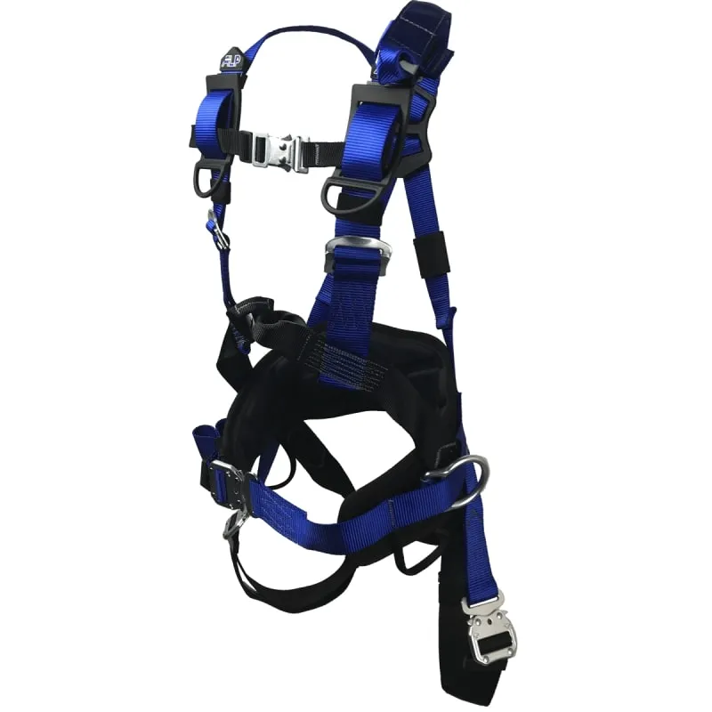Верхние лямки и нижние ремни имеют различные цвета (синий и черный), что помогает правильно одевать привязь.