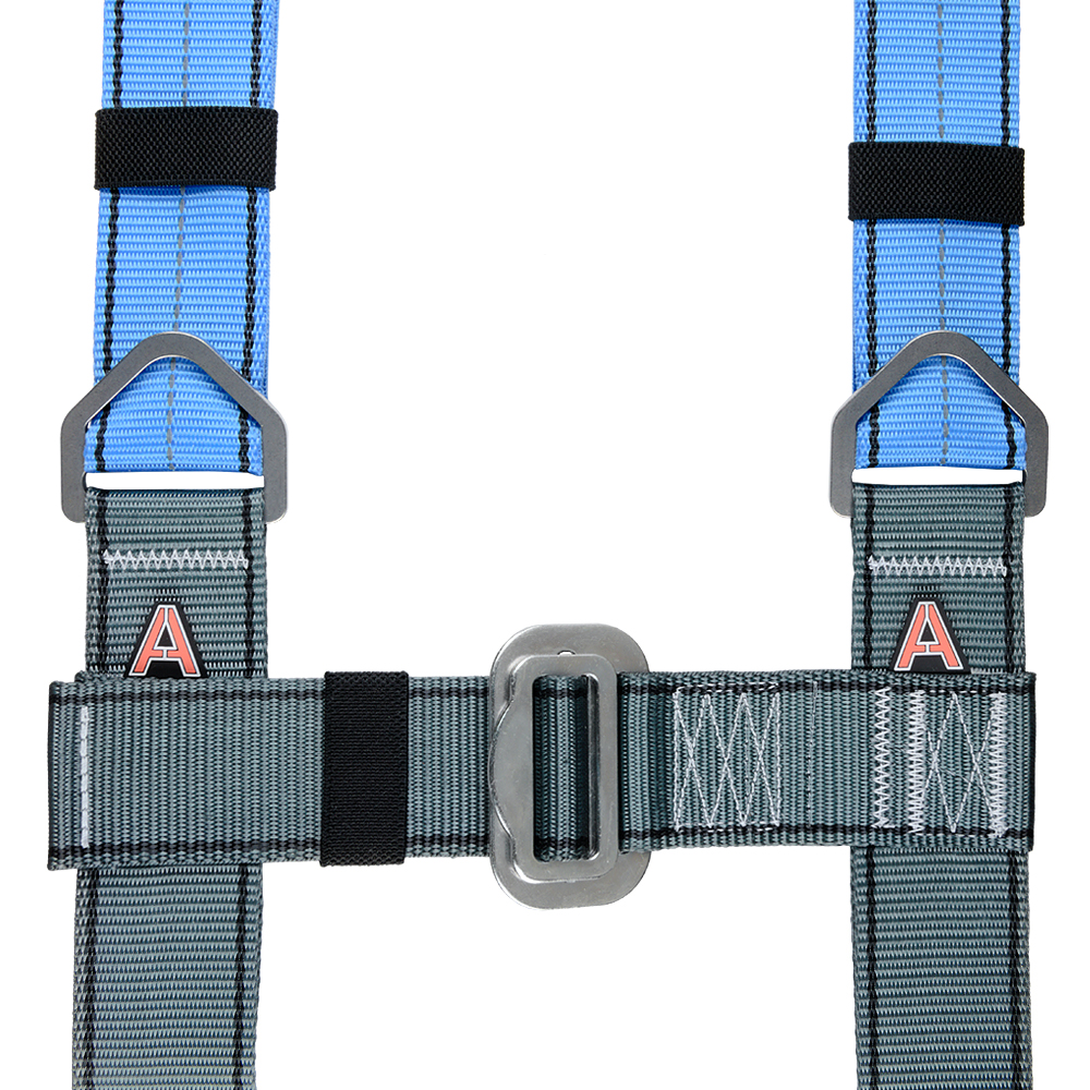 - разный цвет лямок для идентификации верха и низа привязи (синий с СВ нитью - верх привязи, серый - её низ);