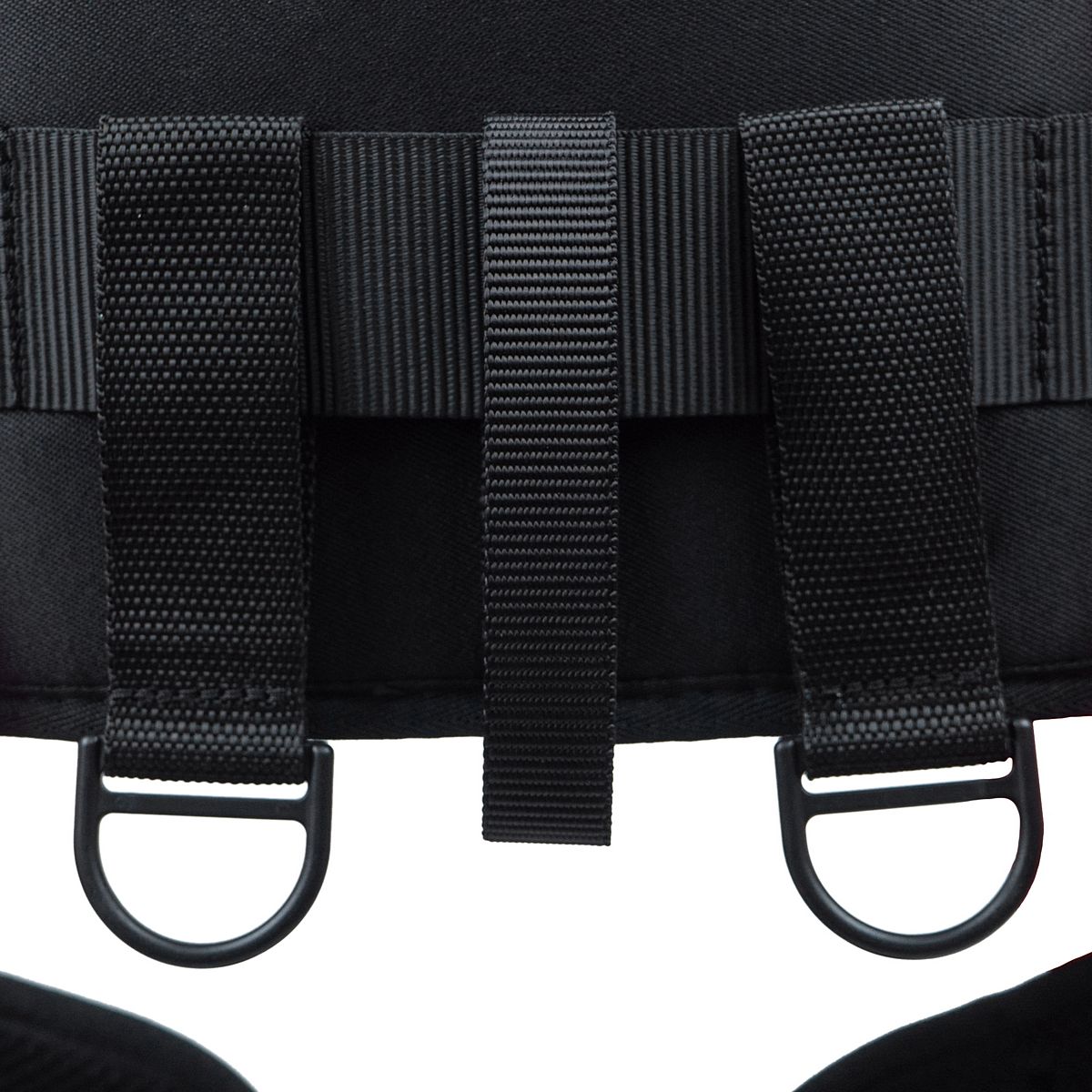 - три точки крепления страховочной подсистемы: D-образные кольца на груди и на спине, удлиняющий элемент «хлястик» на спине;