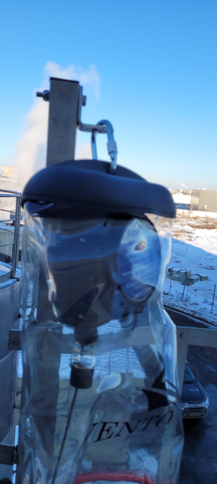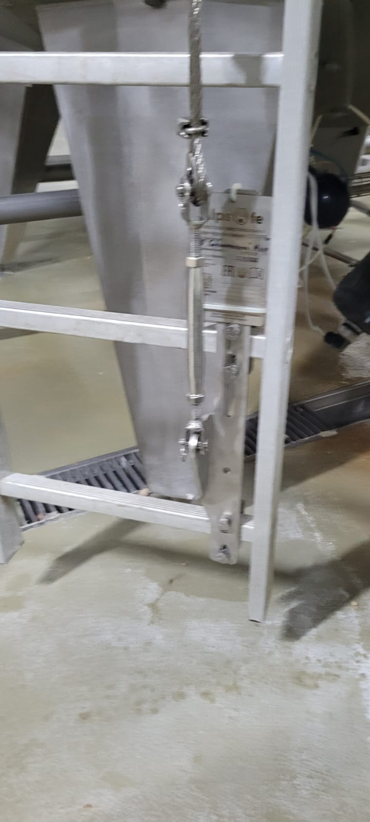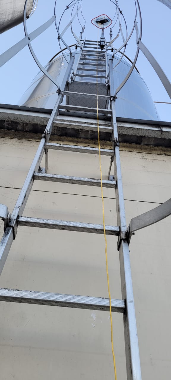 Одна из лестниц была оснащена небольшой площадкой, что исключало возможность установки непрерывной тросовой анкерной линии. Устанавливать две линии на небольшую лестницу нерационально и неудобно. Было предложено установить СИЗ втягивающего типа на удлинительную консоль. Такое решение обеспечивает безопасность и удобство подъема по лестнице. Для защиты СИЗ втягивающего типа от атмосферных осадков предусмотрен защитный чехол.