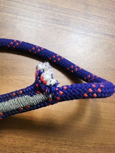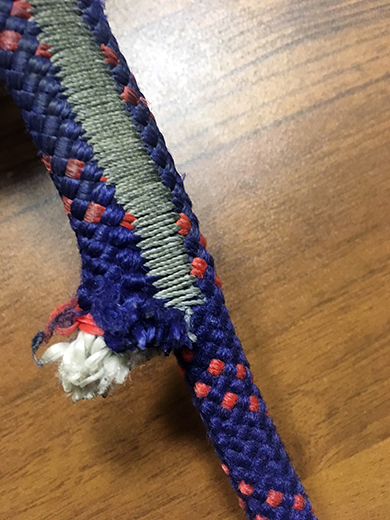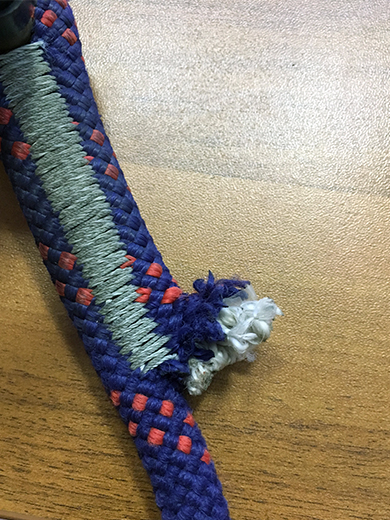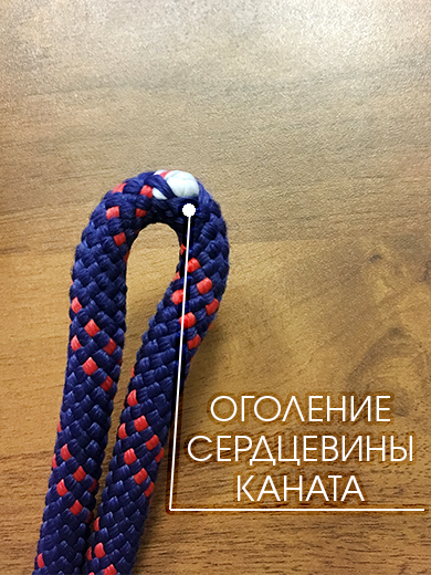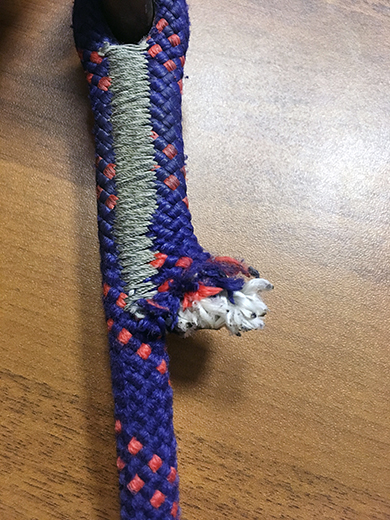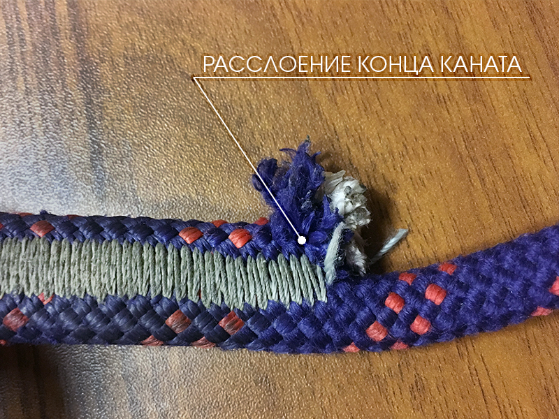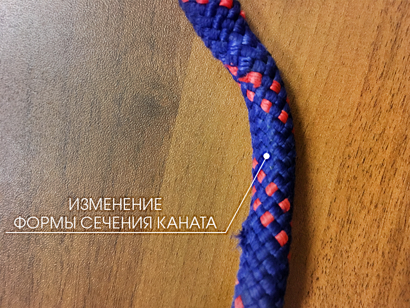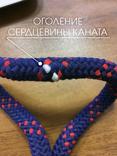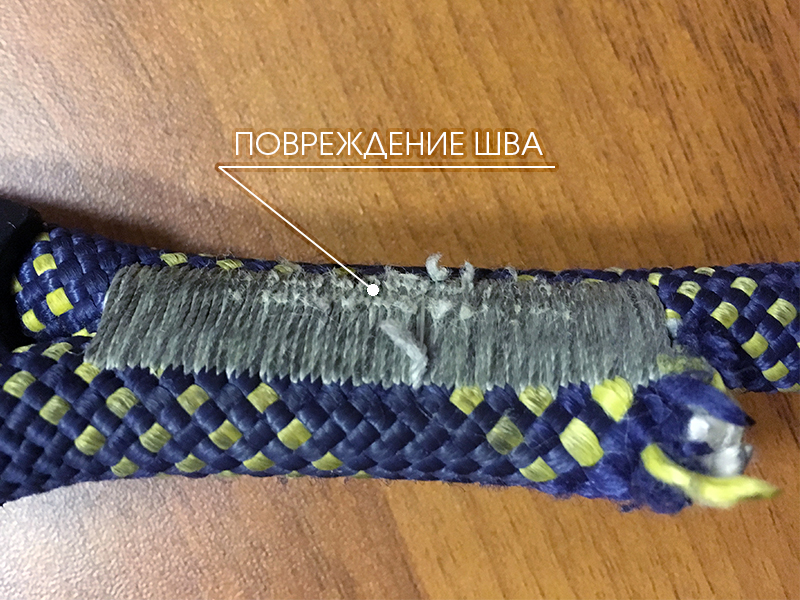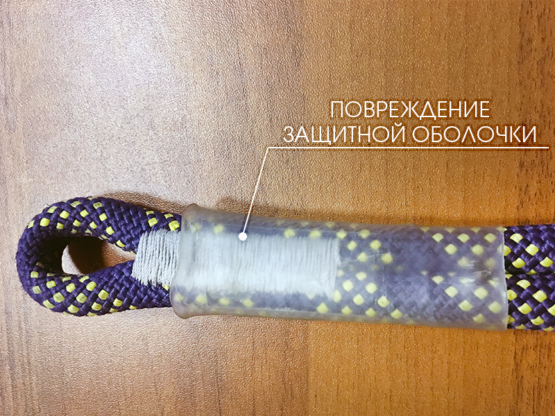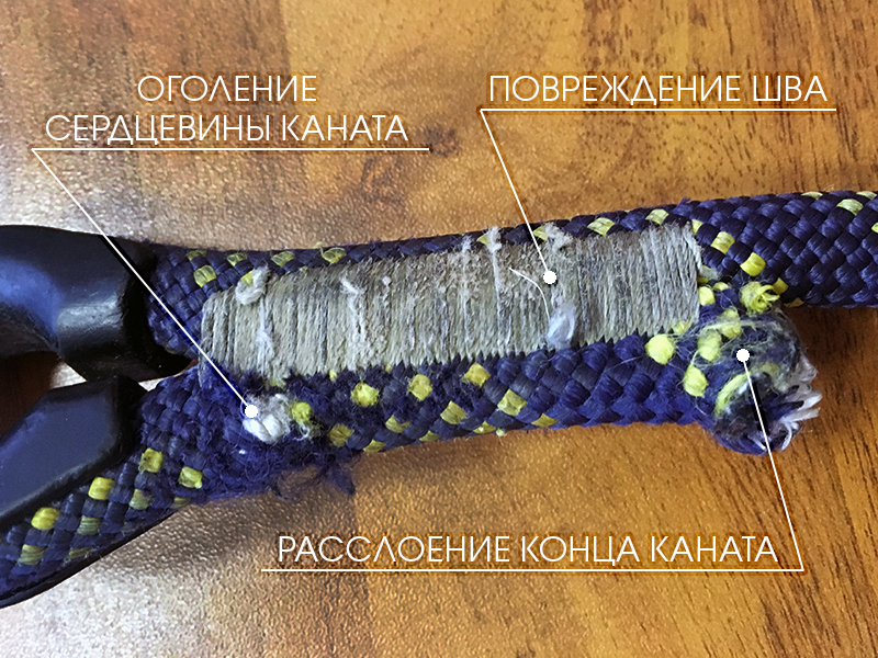 Таким образом нити шва уже не проходят через сердцевину и оплетку каната, а связывают лишь отдельные пряди каната. Фактически, шов становится короче, что ведет к снижению нагрузок, которые он может удерживать без повреждения. Стропы с такими повреждениями были исключены из эксплуатации. Для исключения подобных повреждений необходимо своевременно обрабатывать концы каната (термоножом для веревки) и не допускать их расслоения.