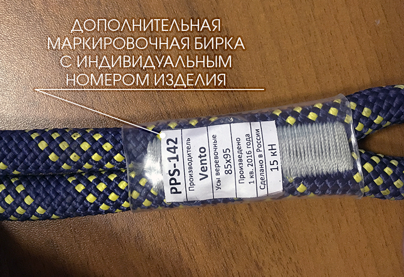 Стандартная маркировка, наносимая производителем на эти стропы, представляет собой бумажную этикетку, на которой указан производитель, наименование изделия, дата производства, минимальная разрушающая нагрузка (защитные свойства), наименование страны-изготовителя, а также пиктограмма, обозначающая необходимость ознакомиться с эксплуатационной документацией. Маркировка защищена пластиковой термоусадочной трубкой. Однако, конкретно на этих изделиях Vento нет индивидуального номера, который бы позволял отличить один экземпляр от другого и вести полноценный учет данных СИЗ. Поэтому, по запросу заказчика, мы добавили на каждый строп дополнительную маркировочную бирку, где указали индивидуальный номер для каждого изделия.