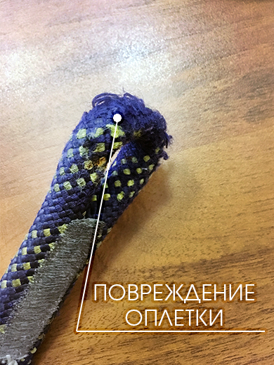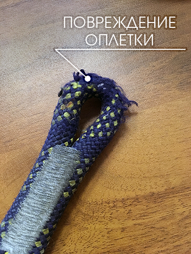 Такое повреждение связано с постоянными локальными нагрузками и изгибом каната. Данная модель стропа присоединяется к привязи полусхватывающим узлом. При длительной циклической нагрузке проявляются такие повреждения.