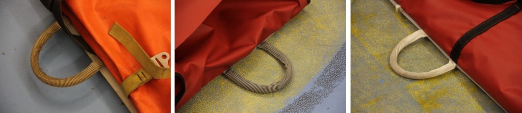 На третьей модели носилок установлено ребро жесткости между нижними ручками для горизонтальной транспортировки в ножной части носилок. Обе пластины закрываются клапаном на липучке. Данное решение позволило превратить носилки в горизонтальный «стол» без эффекта сдавливания пострадавшего. Это, несомненно, является удачным решением.