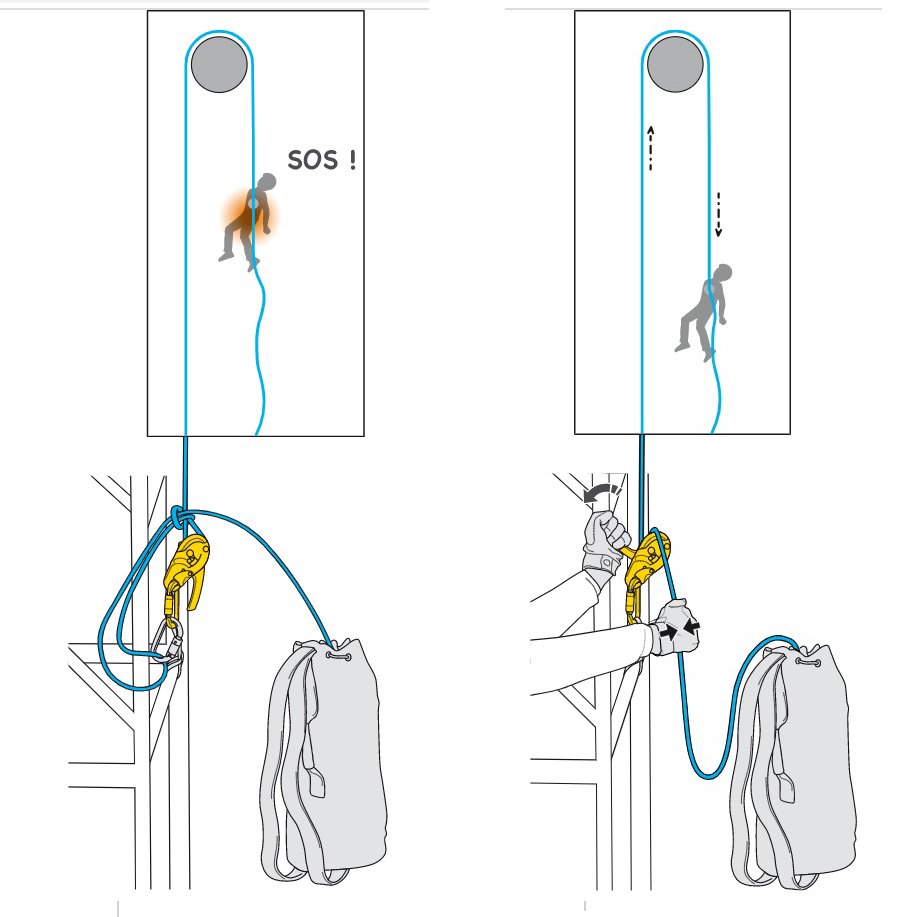 Достоинства: Автоматический контроль скорости спуска пострадавшего. Возможность подъема пострадавшего и спуска на одном устройстве. Возможность эвакуации пострадавшего с сопровождением.