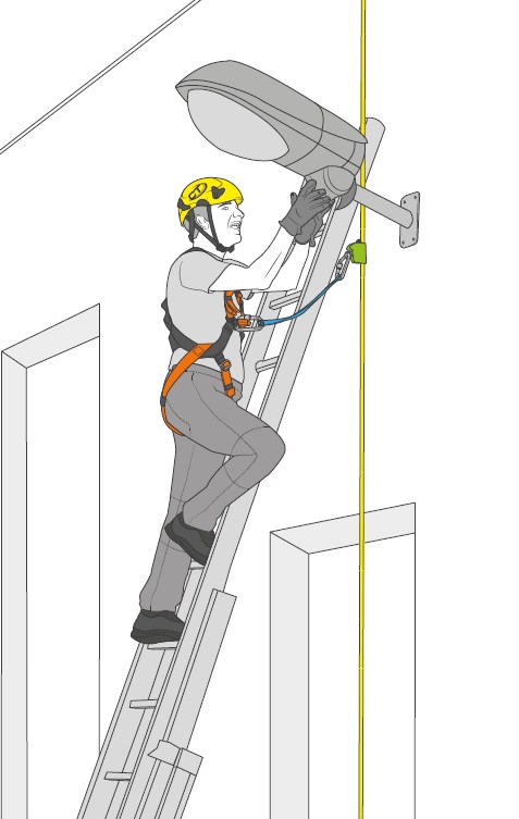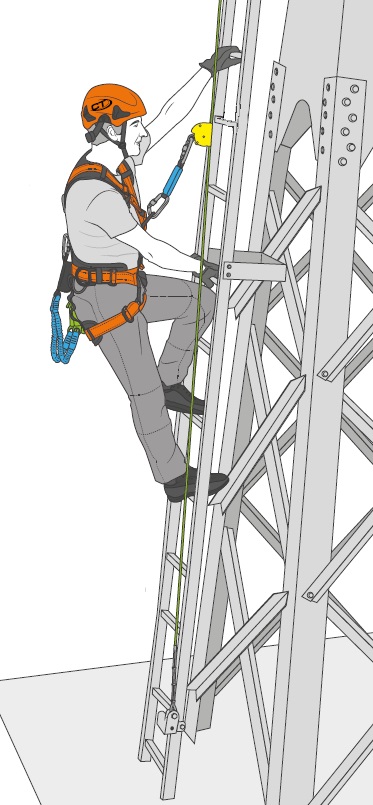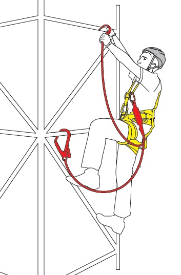 Недостатки: Требуется большой запас свободного пространства под пользователем (большая глубина падения). В зависимости от модели стропа требуется минимум 4-6 метров. Может применяться только на опорах с горизонтальными элементами, соответствующими ширине раскрытия карабинов на стропе. Медленное передвижение работника.