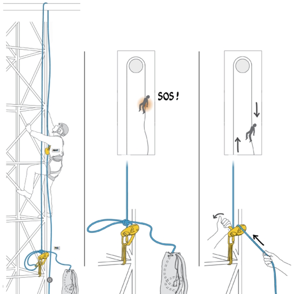 Подъем работника, использующего систему канатного доступа, при помощи предустановленной системы спасения