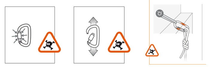 Большинство из нас считают карабин надежным элементом в системе обеспечения безопасности. Однако это не так. В обычных условиях при подъеме, спуске или проведении спасательных работ могут возникать нагрузки, превышающие 8 кН, и, следовательно, единственно безопасным нагружением карабина, изготовленного в соответствии с Европейскими нормами, является нагружение вдоль основной оси при закрытой защелке. При этом реальных ситуаций «нештатной» нагрузки на карабин существует довольно много. В некоторых случаях прочность карабина значительно ниже и может опускаться до 2-3 кН. Например, в ситуации, когда происходит нагрузка на излом, на муфту и т.д. Понимая это, европейские производители рисуют страшные картинки в инструкциях по эксплуатации.