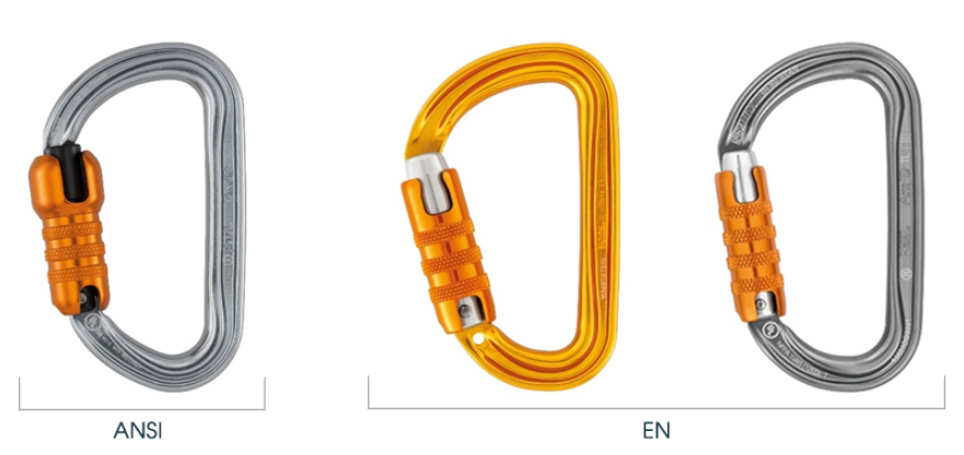 Можно сравнить три сходных карабина, один из которых (Petzl BM'D TL) соответствует требованиям ANSI, а другие два (Petzl SM'D TL и Petzl AM'D TL) — только Европейским нормам. Визуально видно более выступающую муфту, которая может с большой вероятностью зацепиться за другие элементы.